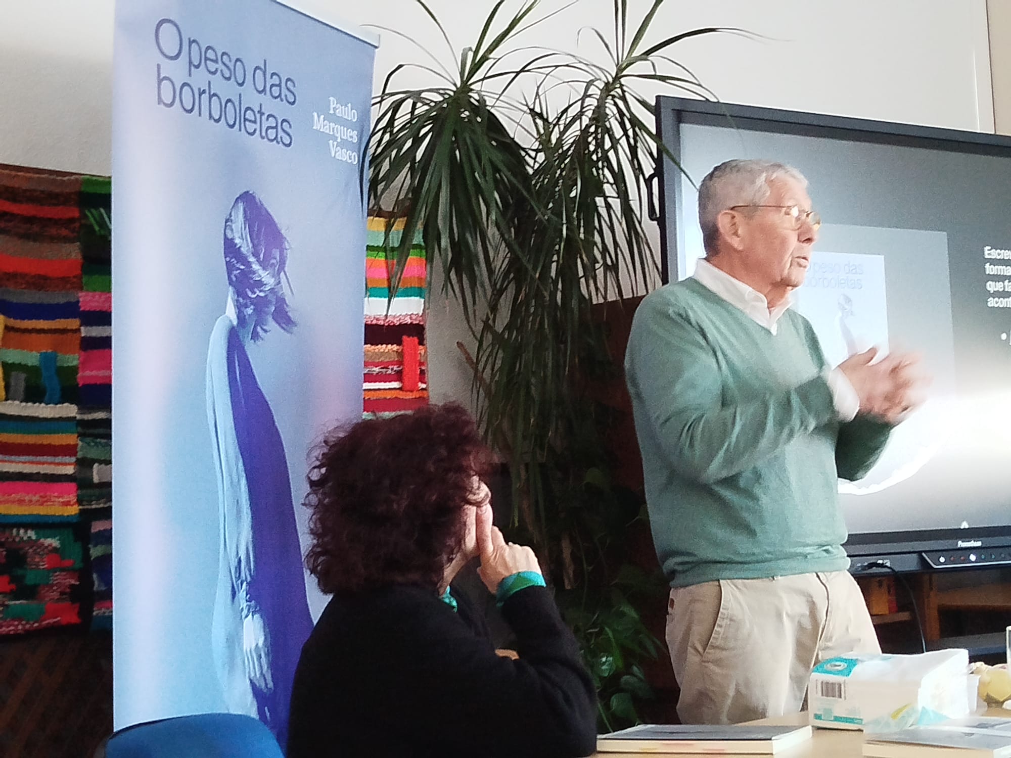 No âmbito das atividades da Semana da Leitura, hoje, dia 24 de março, a Escola Maria Lamas foi visitada pelo Dr. Paulo Vasco, médico e escritor, que veio conversar com alunos das turmas 11.º LHA 12.º LHA, 12.ºLHB, 12.º CTA e 12.º CTC, que foram divididos em dois grupos. Estiveram presentes as respetivas professoras de português, Ana Paula Godinho e Fernanda Pereira. Estas conversas centraram-se na obra “O peso das borboletas”, galardoada com o Prémio Florbela Espanca. Este prémio foi atribuído por opinião unânime do júri, entre quatro dezenas de concorrentes. Os jovens foram cativados pela capacidade de comunicação do Dr. Paulo Vasco, que usou suportes de imagem, com parcimónia, mas criteriosamente escolhidos. A essência da literatura foi explicada na perspetiva do autor e os alunos colaboraram lendo um micro conto, da sua autoria, e dois pequenos excertos de “O peso das borboletas”. No fim de cada sessão, alguns jovens colocaram perguntas.