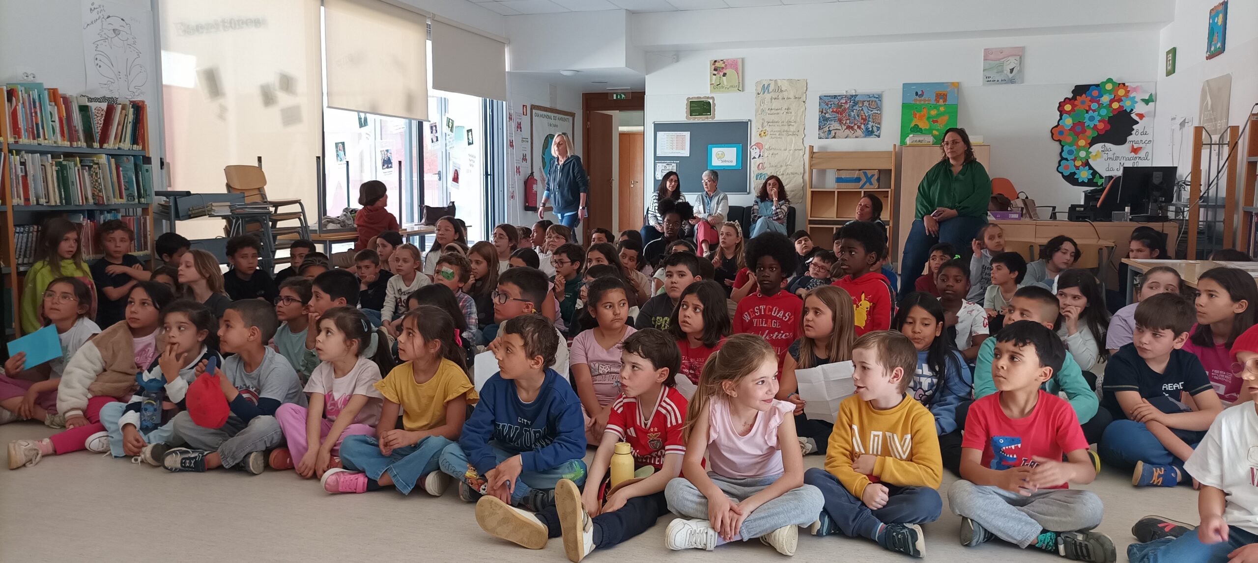 A educadora Antónia Costa desafiou a professora Maria do Carmo Peixoto a participar numa atividade da Semana da Leitura — e, claro, os grupos de alunos de ambas acolheram a proposta com grande entusiasmo. Assim, a professora bibliotecária encontrou estas crianças num cenário verdadeiramente encantador: ao ar livre, como se estivessem pousadas nos ramos da árvore frondosa que lhes servia de cenário. Bem, a magia começou ali! Os mais pequeninos deram início ao encontro com a primeira “oferta” aos mais velhos: uma coreografia que rapidamente conquistou todos, acabando por ser repetida em conjunto. De seguida, os mais velhos apresentaram várias performances inspiradas em diferentes livros — cantaram, leram, declamaram e deram vida às histórias com expressividade e criatividade. Foram muitos os livros partilhados sob o sol primaveril, como se fossem apetitosas iguarias num piquenique literário. A atividade terminou com uma segunda “oferta” dos mais novos, desta vez, mesmo para comer: pequenos beijinhos doces, de farinha e açúcar, que selaram este encontro especial com um gesto de carinho e amizade. A iniciativa destacou a importância da leitura e da interação entre diferentes faixas etárias, num ambiente que mostrou como a literatura pode ser vivida e partilhada de forma criativa, envolvente e encantadora.